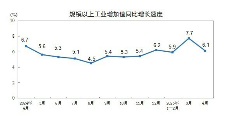 4月份规模以上工业增加值同比实际增长6.1%4月份规模以上工业增加值同比实际增长6.1%